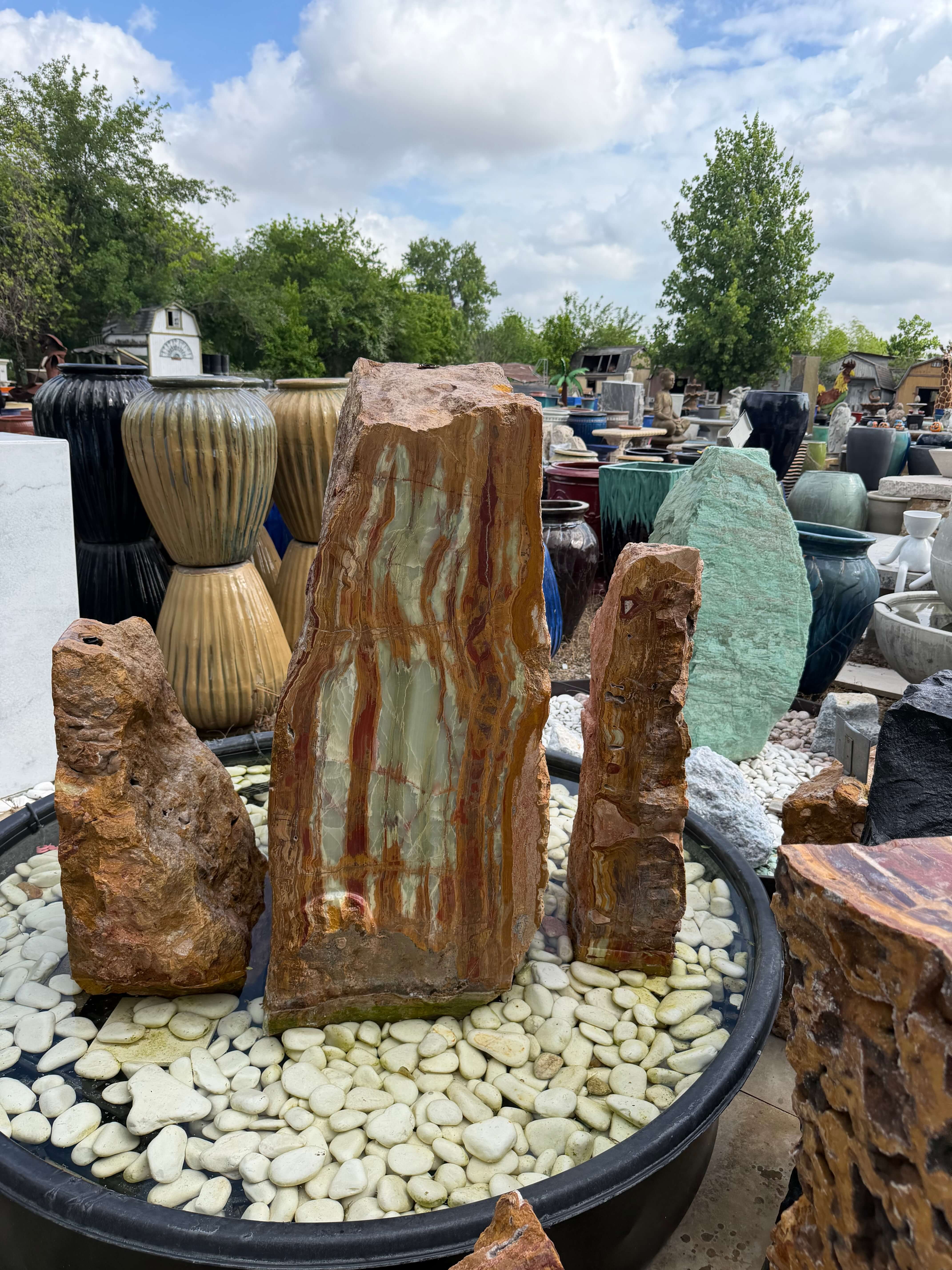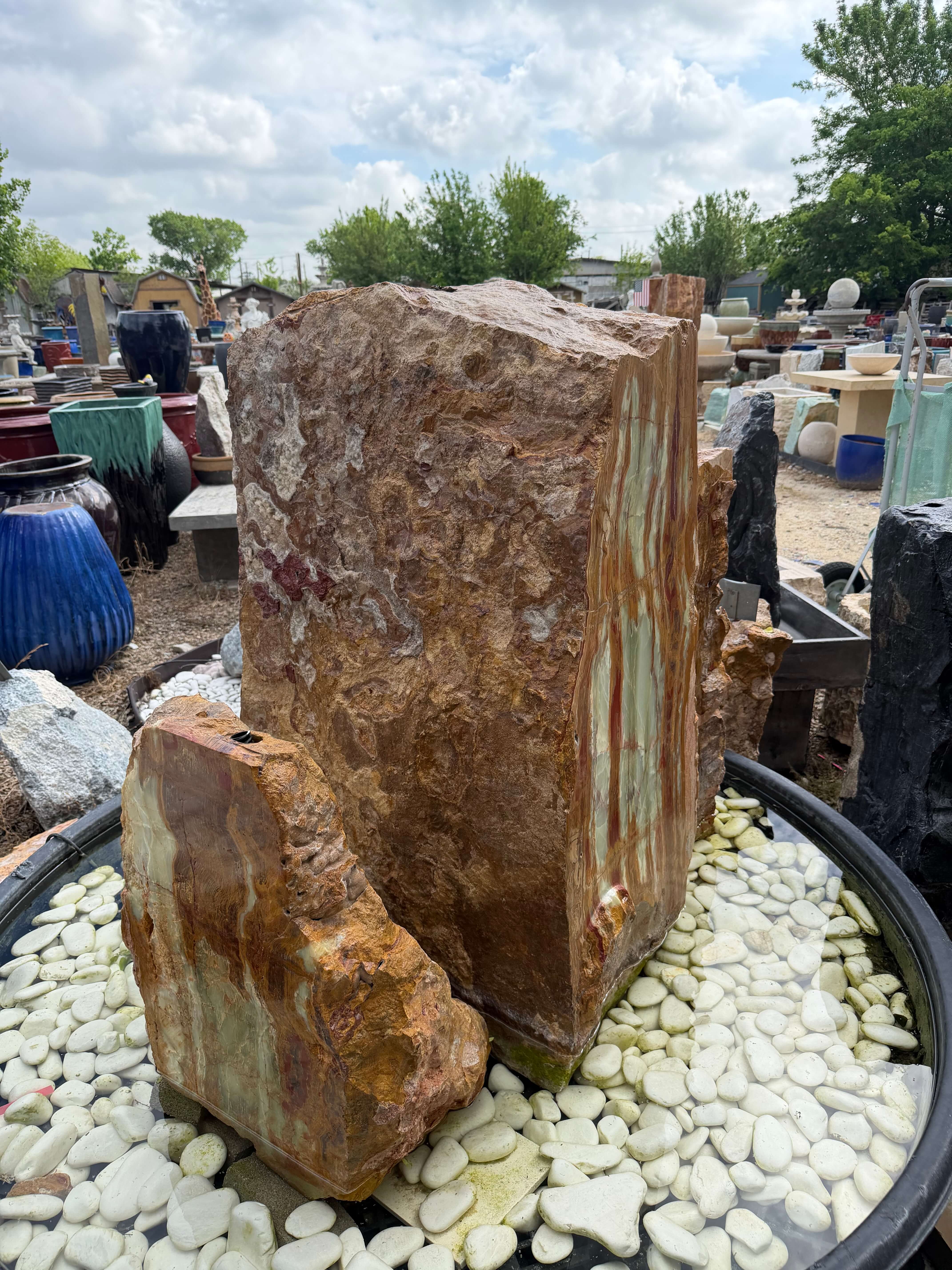 A compact and modern onyx stone fountain perfectly fitted for a 24x24 square plastic pool, ideal for contemporary interior or exterior accents.